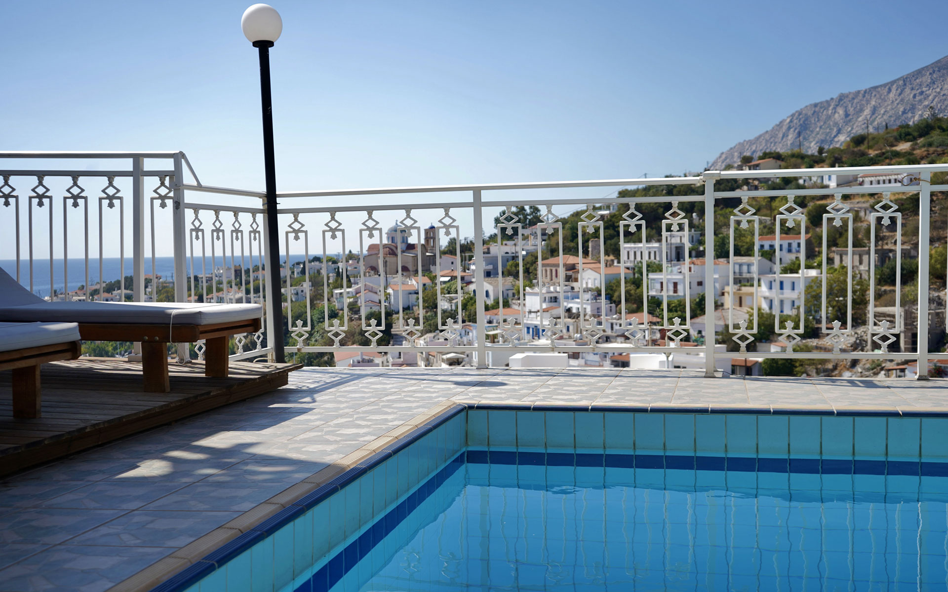 The common areas include a beautiful courtyard with sun loungers around the pool, to enjoy the Greek sun.