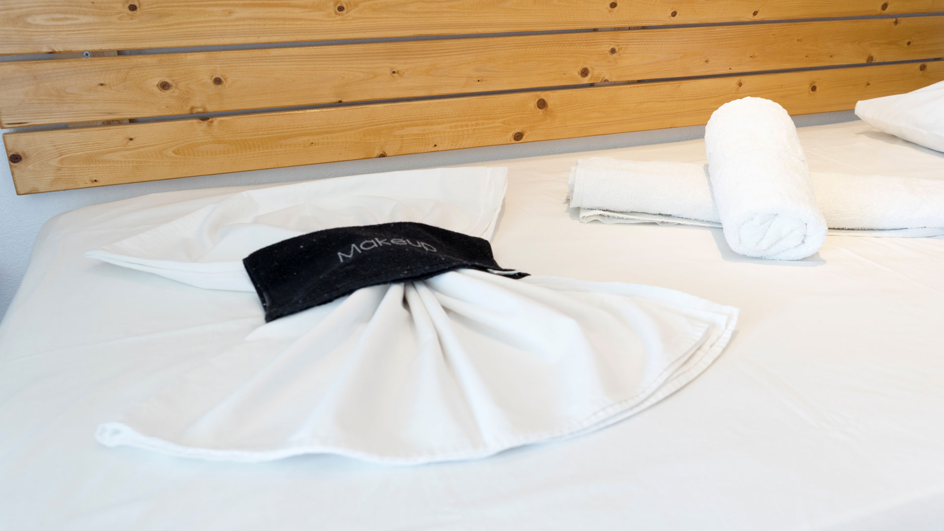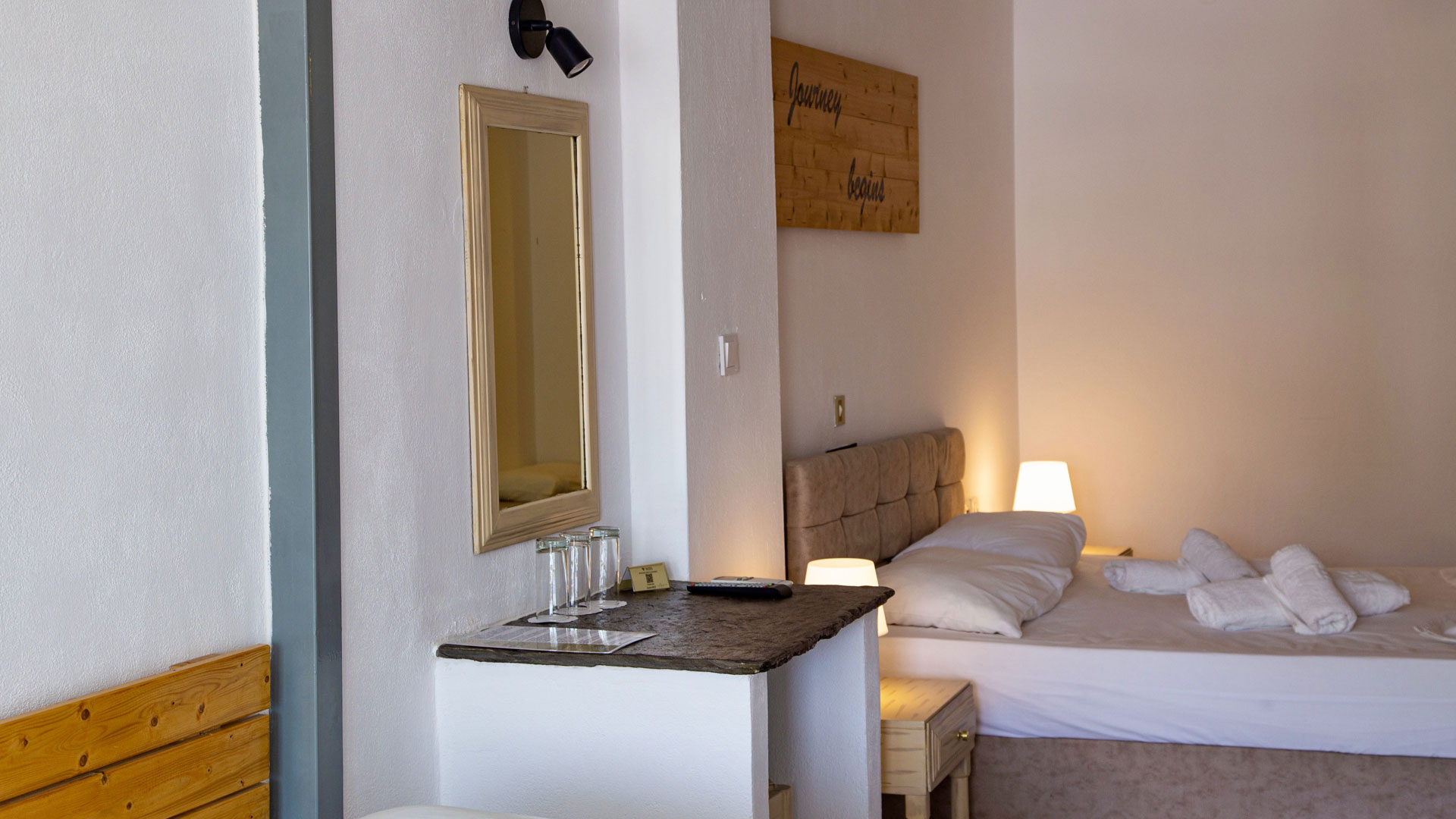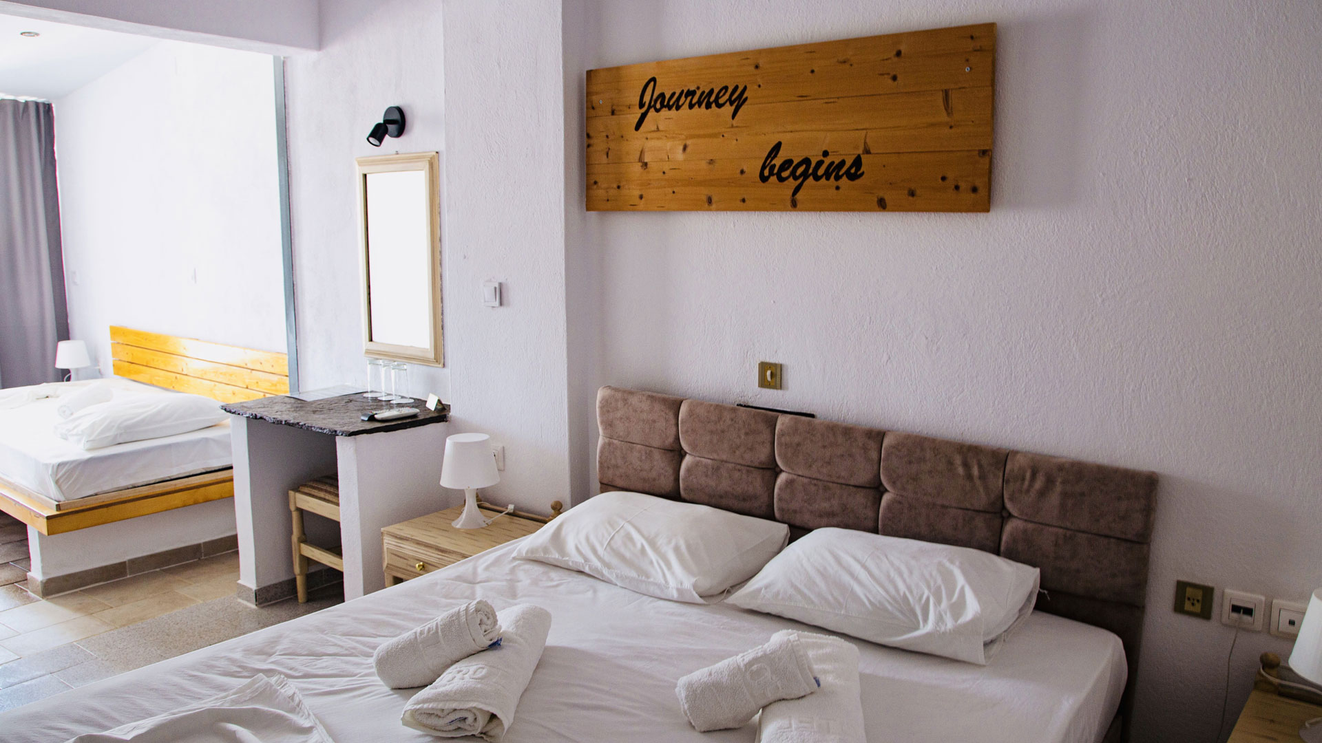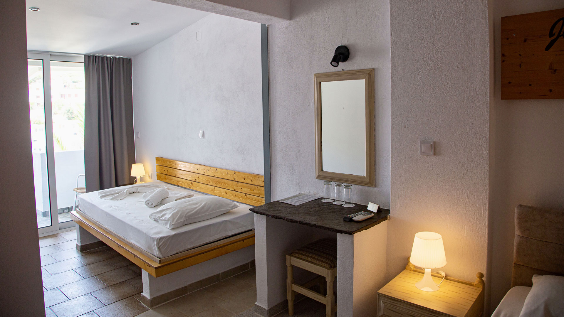 The room is comfortably furnished with 1 double and 1 single bed. It features a balcony furnished with a table and chairs, individually adjustable air conditioning, satellite TV, a safe hidden in the closet (free of charge), a mini fridge, direct dial telephone, free wireless internet (Wi-Fi), shower/WC, hairdryer, iron upon request, and free pool/beach towels.